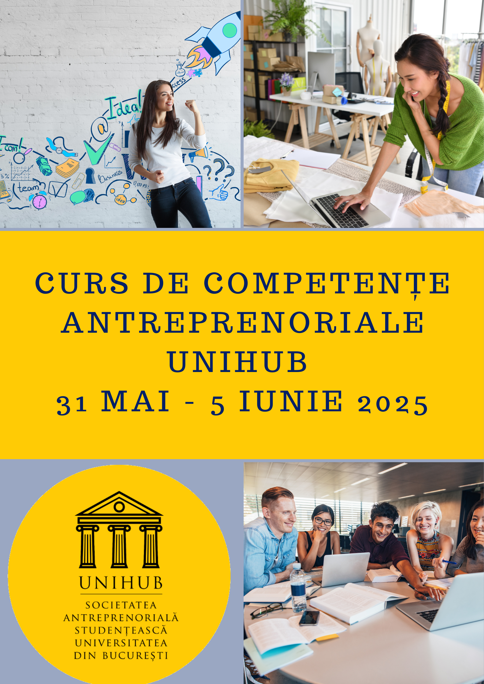 În perioada 31 mai – 5 iunie 2025, Societatea Antreprenorială Studențească (UNIHUB) invită studenții Universității din București de la toate ciclurile de învățământ la un curs de competențe antreprenoriale care cuprinde 5 module: Bazele Antreprenoriatului, Antreprenoriat Sustenabil, Marketingul Digital pentru Afaceri Sustenabile, Management Financiar, Dezvoltarea modelului de business (Business Model Canvas).