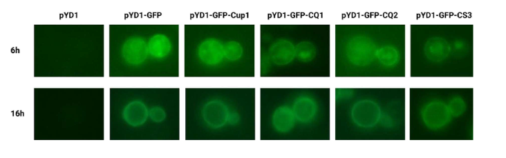 Construction of pYD1-GFP: the expression vector was obtained and verified. Initial tests confirmed GFP localization on the cell surface.