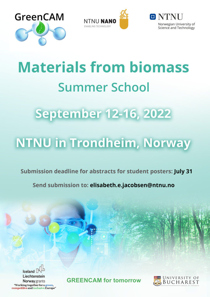 BioMat is organized by Norwegian University of Science and Technology, NTNU (Trondheim, Norway) in collaboration with University of Bucharest (Romania) in the frame of GREENCAM project. BioMat is directed to MSc/PhD students, postdocs and early-career PIs. Also, professors and researchers from academia and industry with expertise in the field of biomass valorization are invited to participate in the summer school.