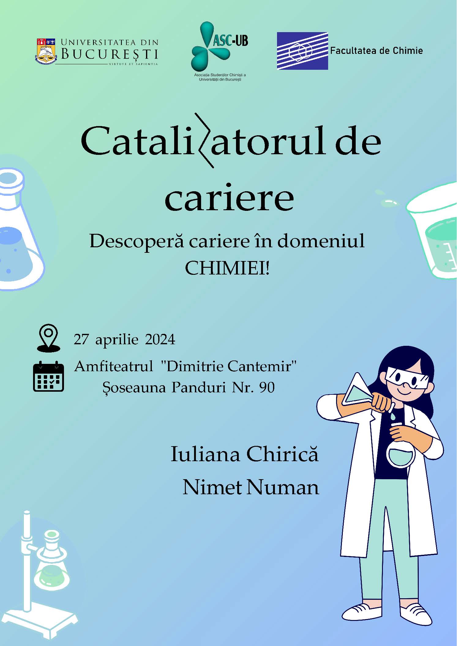 Asociatia Studenților Chimiști a Universității din București (ASC-UB) și Facultatea de Chimie a Universității din București, organizează cea de-a III-a ediție a proiectului "Catalizatorul de Cariere", eveniment ce are drept scop îndrumarea studenților în alegerea unei cariere atractive și captivante în domeniul chimiei.