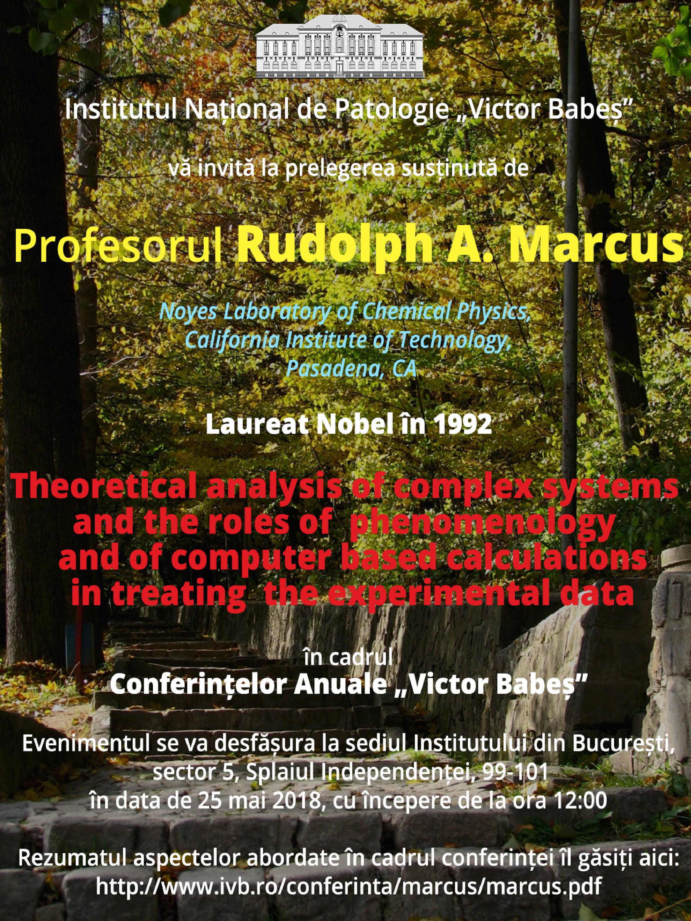 1. 25 mai 2018, ora 12:00: Conferința susținută de Profesorul Rudolph Marcus, Laureat Nobel în 1992, la Institutul Național "Victor Babeș" - afiș
