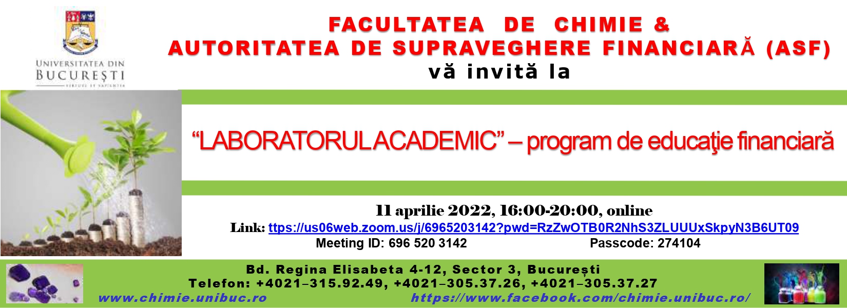 Passcode: 274104Luni, 11 aprilie 2022, Facultatea de Chimie a Universității din București găzduiește seminarele de educație financiară din programul Autorității de Supraveghere Financiară dedicate mediului universitar – „Laboratorul Academic”. Acestea vor avea loc online în intervalul orar 16:00-20:00, pe platforma Zoom.