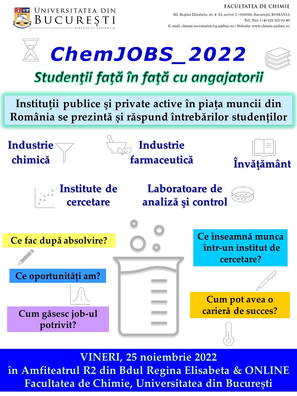 Vineri, 25 noiembrie 2022, Facultatea de Chimie a Universității din București va organiza ChemJOBS_2022, un proiect menit să aducă față în față angajatorii și studenții din domeniile chimiei, biochimiei, chimiei medicale și farmaceutice.