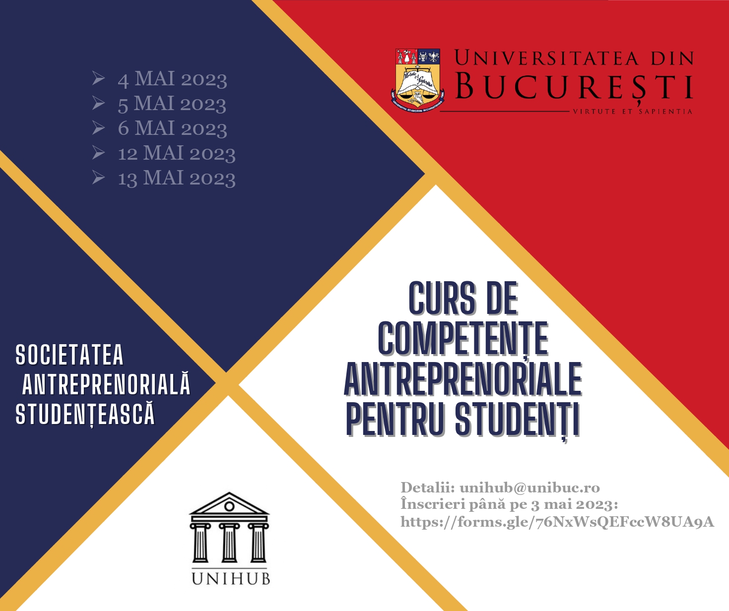 În perioada 4-13 mai 2023, Societatea Antreprenorială Studențească (UNIHUB) invită studenții Universității din București de la toate ciclurile de studii la CURSUL DE COMPETENȚE ANTREPRENORIALE cu titlul „Învață să gândești și să acționezi ca un antreprenor” care cuprinde modulele: