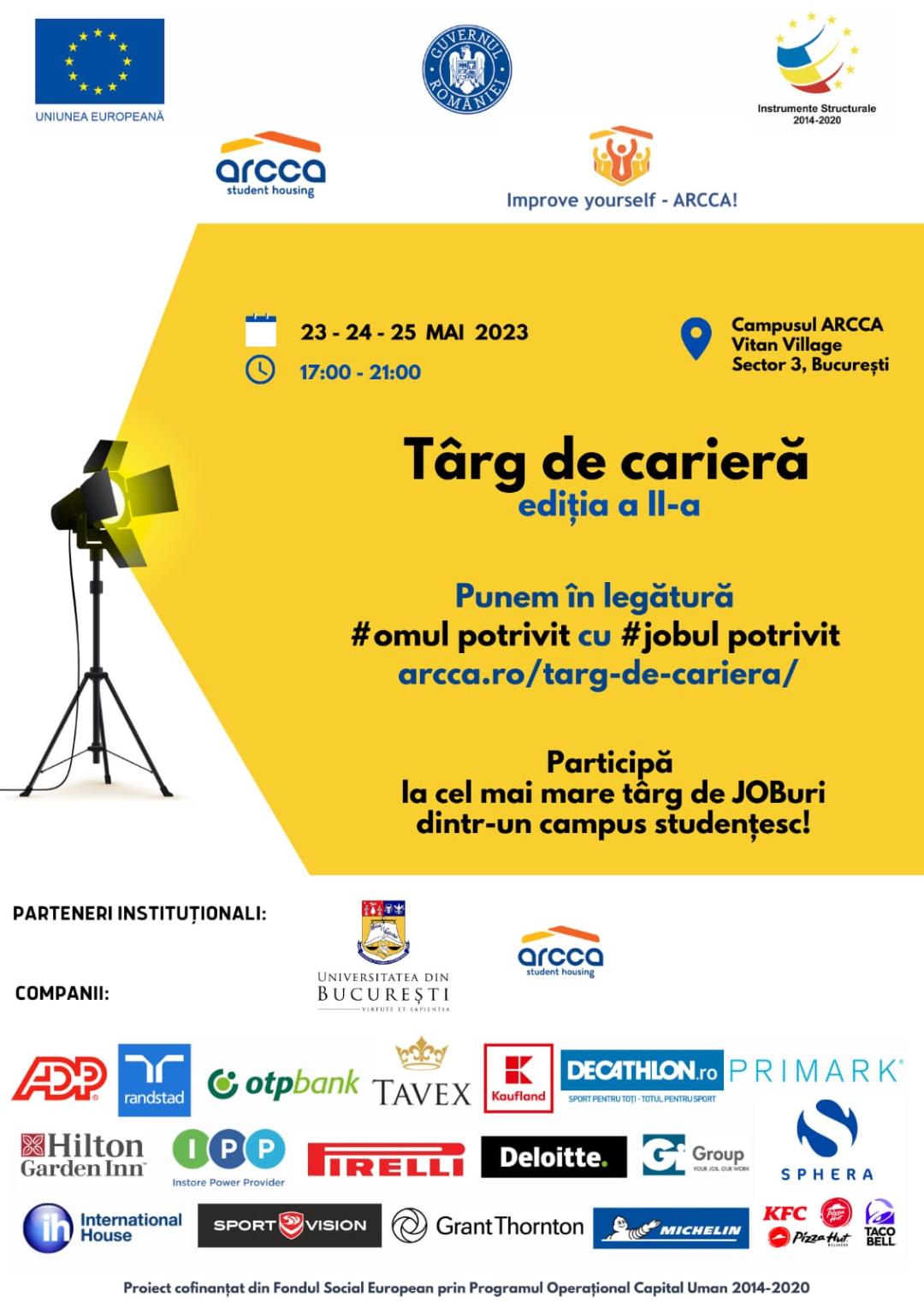 Dragi studenți, în perioada 23 - 25 mai 2023, între orele 17:00 - 21:00 va avea loc Bursa locurilor de muncă, ediția a II-a, în Campusul ARCCA - Vitan Village din Sector 3.