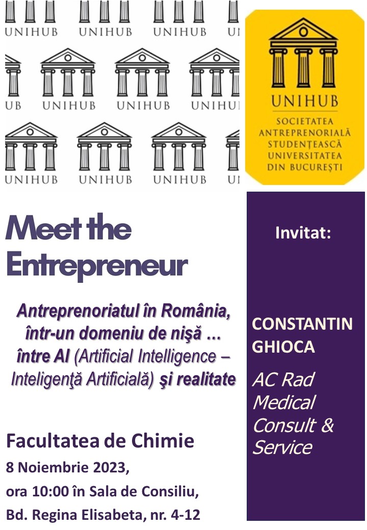 Facultatea de Chimie a Universității din București organizează în parteneriat cu Societatea Antreprenorială Studențească UNIHUB o nouă întâlnire din seria „Meet the Entrepreneur”.