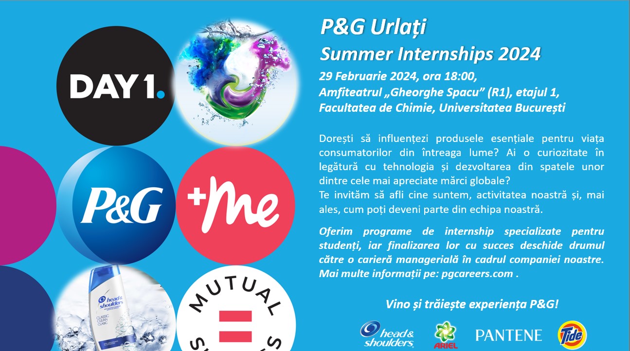 Joi, 29 februarie 2024, de la ora 18:00, va avea loc întâlnirea studenților Facultății de Chimie cu reprezentanți ai "Procter & Gamble" (P&G), care vor prezenta compania, programul de internship și posibilitățile de dezvoltare profesională în companie.