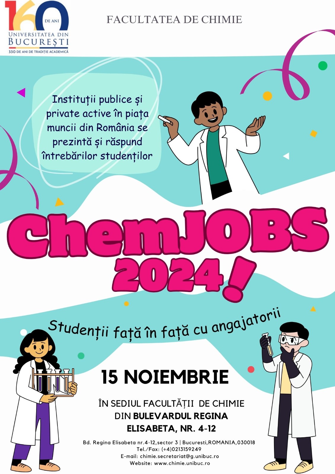 Vineri, 15 noiembrie 2024, Facultatea de Chimie a Universității din București va organiza târgul de cariere ChemJOBS_2024. Evenimentul își propune să aducă împreună tineri profesioniști, studenți și absolvenți ai Facultății de Chimie, cu potențiali angajatori din domeniul chimiei și din domenii conexe, atât din instituții publice, cât și private.