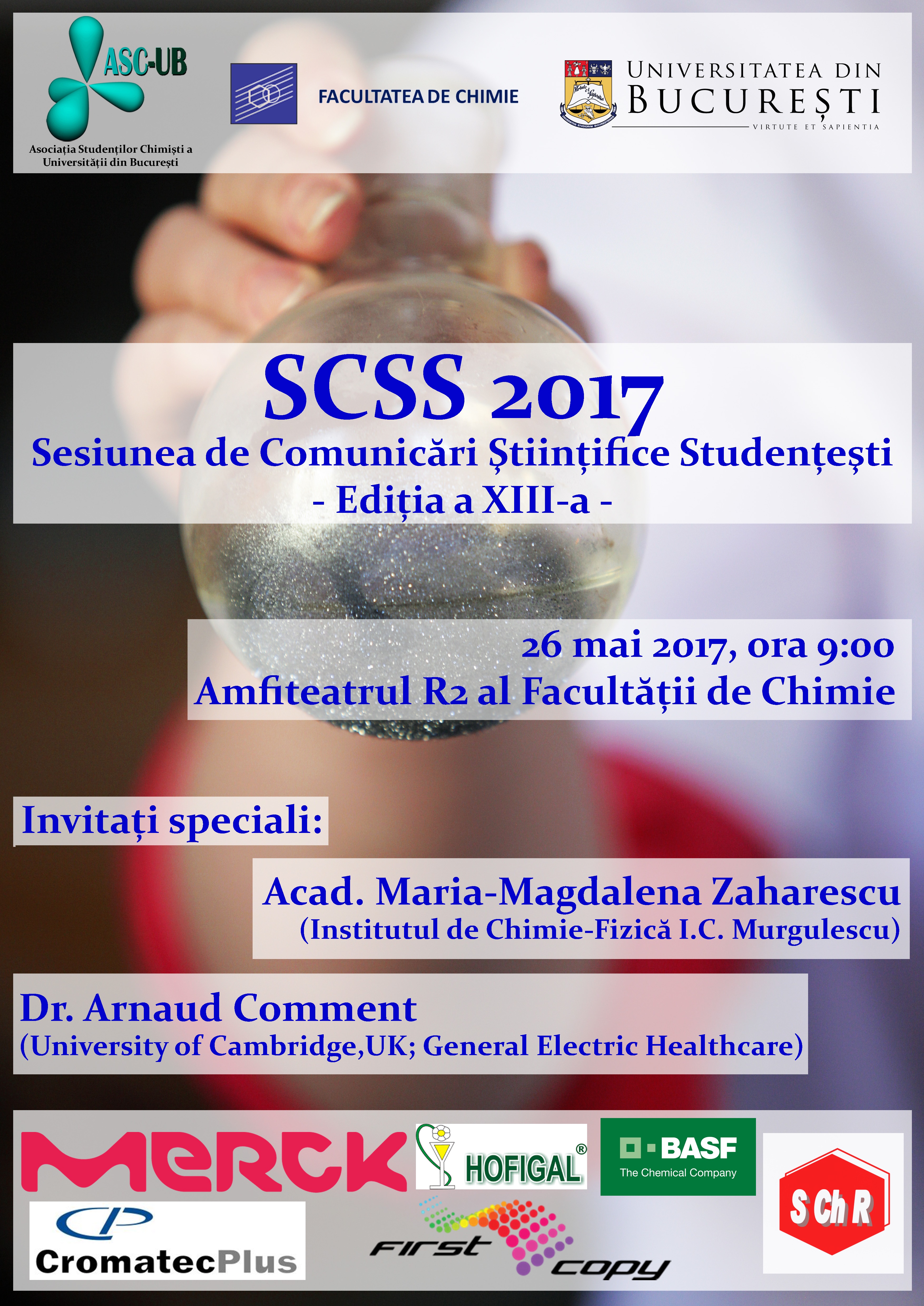 Asociația Studenților Chimiști a Universității din București (ASC-UB) și Facultatea de Chimie vă invită să participați la prezentările ce vor avea loc în deschiderea celei de a XIII-a ediții a Sesiunii de Comunicări Ştiinţifice Studenţeşti. Acestea vor fi susținute de Acad. Dr. Maria Magdalena Zaharescu(Institutul de Chimie-Fizică I.C.Murgulescu) și Dr. Arnaud Comment (University of Cambridge, UK and General Electric Healthcare)Desfășurarea întregului eveniment va avea loc în data de 26 mai 2017, în amfiteatrul I.G. Murgulescu (R2), Facultatea de Chimie (Bd. Regina Elisabeta), începând cu orele 09.00