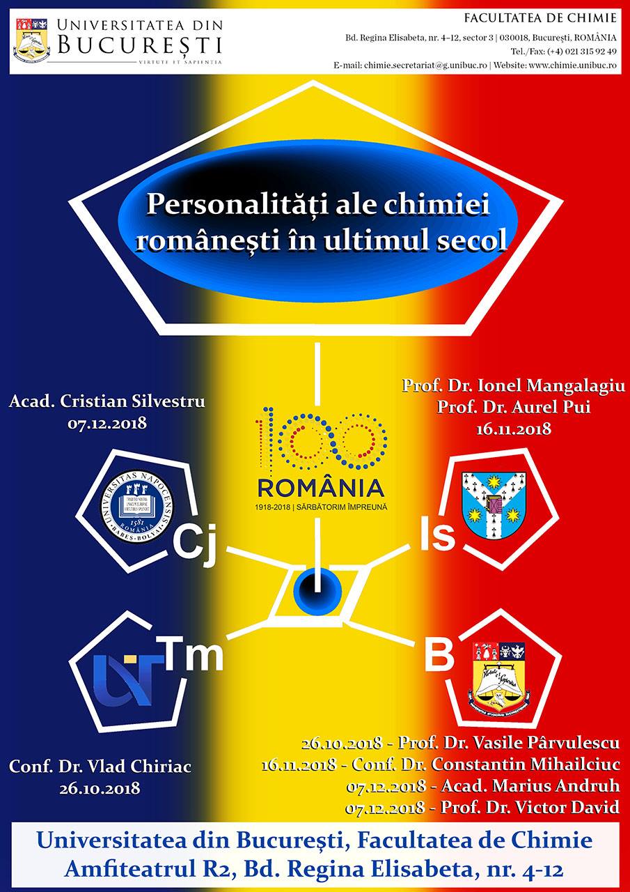 Sub titlul Personalităţi ale chimiei româneşti în ultimul secol sunt reunite conferinţe dedicate principalelor personalități care au contribuit la dezvoltarea chimiei româneşti, învățământului academic și cercetării în acest domeniu al științei din România. Personalităţi actuale ale chimiei românești din București, Iași, Cluj-Napoca și Timișoara vor prezenta Școlile de Chimie din centrele universitare respective în lunile octombrie (26.10.2018), noiembrie (16.11.2018) şi decembrie (7.12.2018).