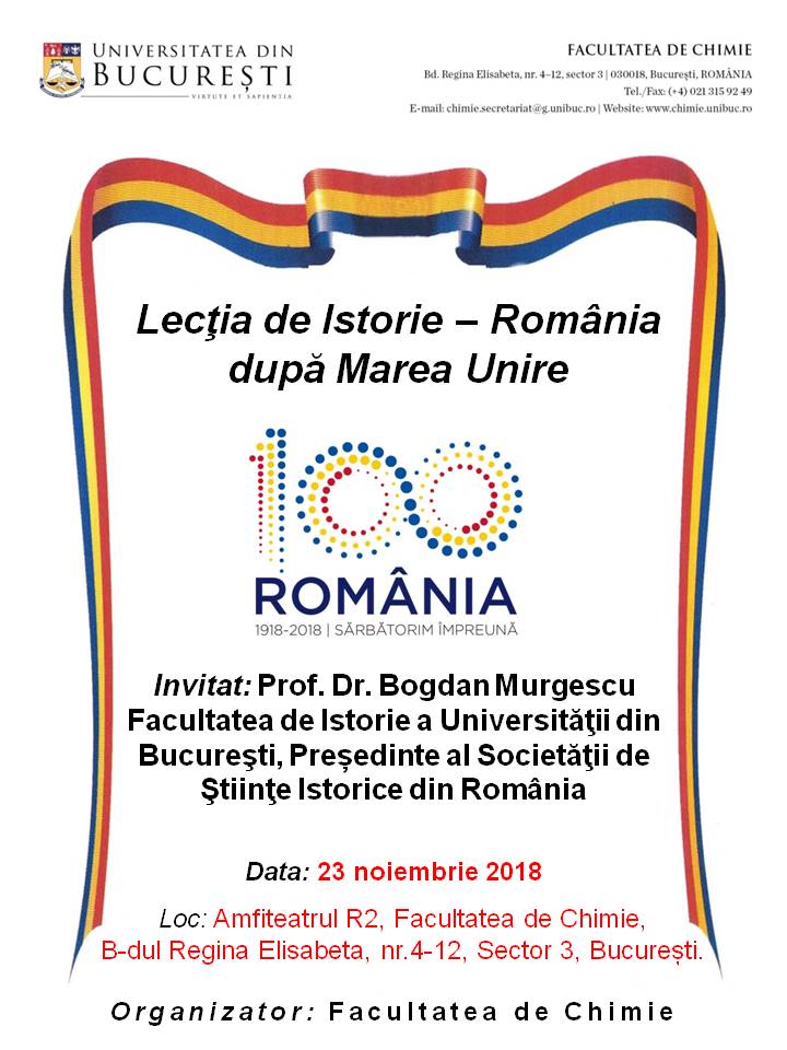 Un alt eveniment dedicat Centenarului României este conferinţa Lecţia de Istorie – România după Marea Unire. Prof. Dr. Bogdan Murgescu (Facultatea de Istorie, Universitatea din Bucureşti) le va prezenta studenţilor chimiști, pe 23 noiembrie 2018, pagini importante din istoria neamului românesc din ultimul secol, le va vorbi despre întemeierea și edificarea statului național român modern, despre dezvoltarea identităţii naţionale și evoluţia temporală constantă a spaţiului românesc.