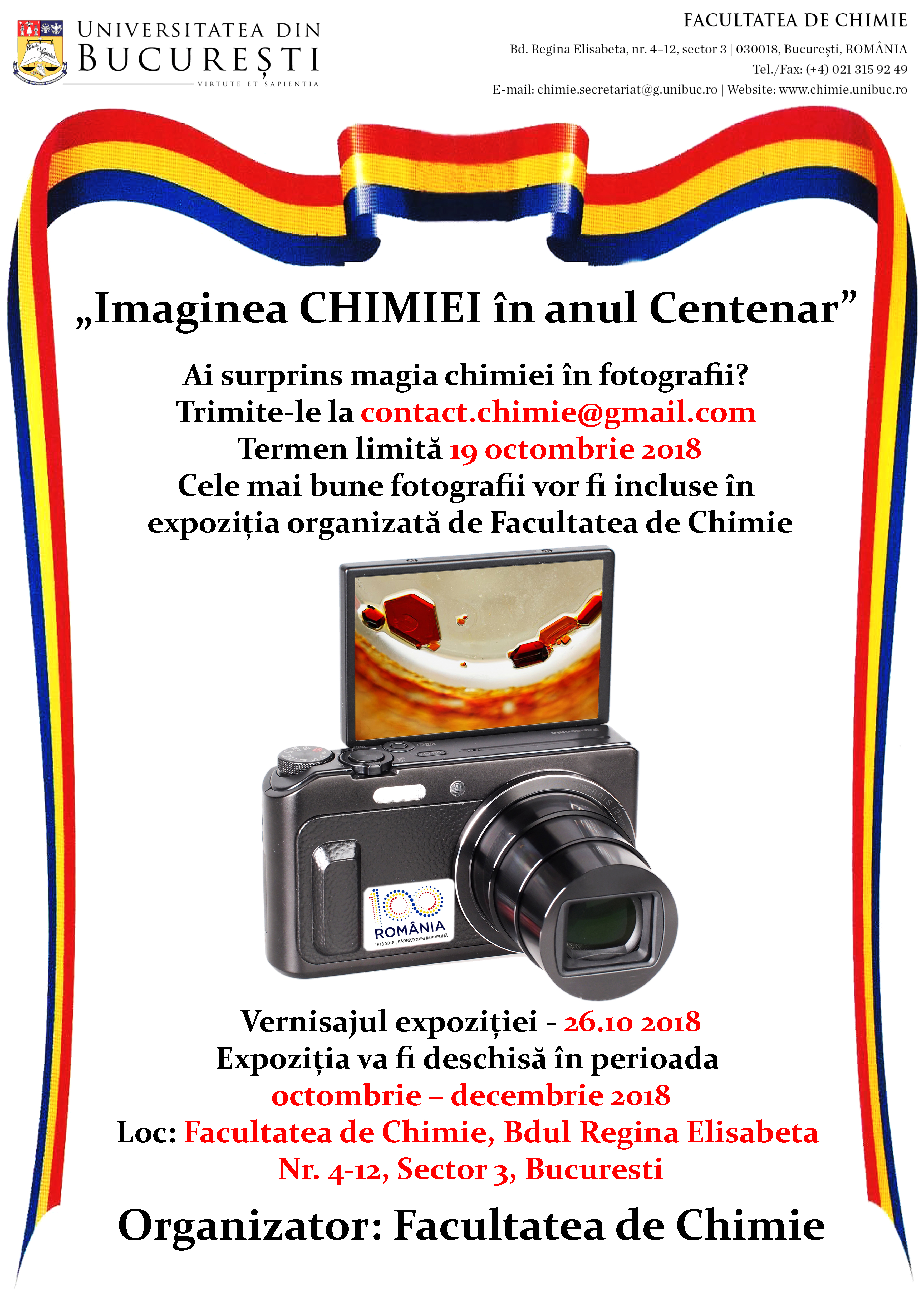 Expoziţia de fotografie Imaginea CHIMIEI în anul Centenar va avea vernisajul pe 26 octombrie 2018. Vor fi expuse fotografii realizate de studenţi, alumni şi cadre didactice ale Facultăţii de Chimie a Universităţii din Bucureşti. Această expoziție, ce va putea fi vizitată în perioada 26 octombrie – 22 decembrie 2018, îşi propune să dezvăluie frumusețea şi magia chimiei, o lume inedită, colorată, fascinantă, ştiinţă şi artă deopotrivă.
