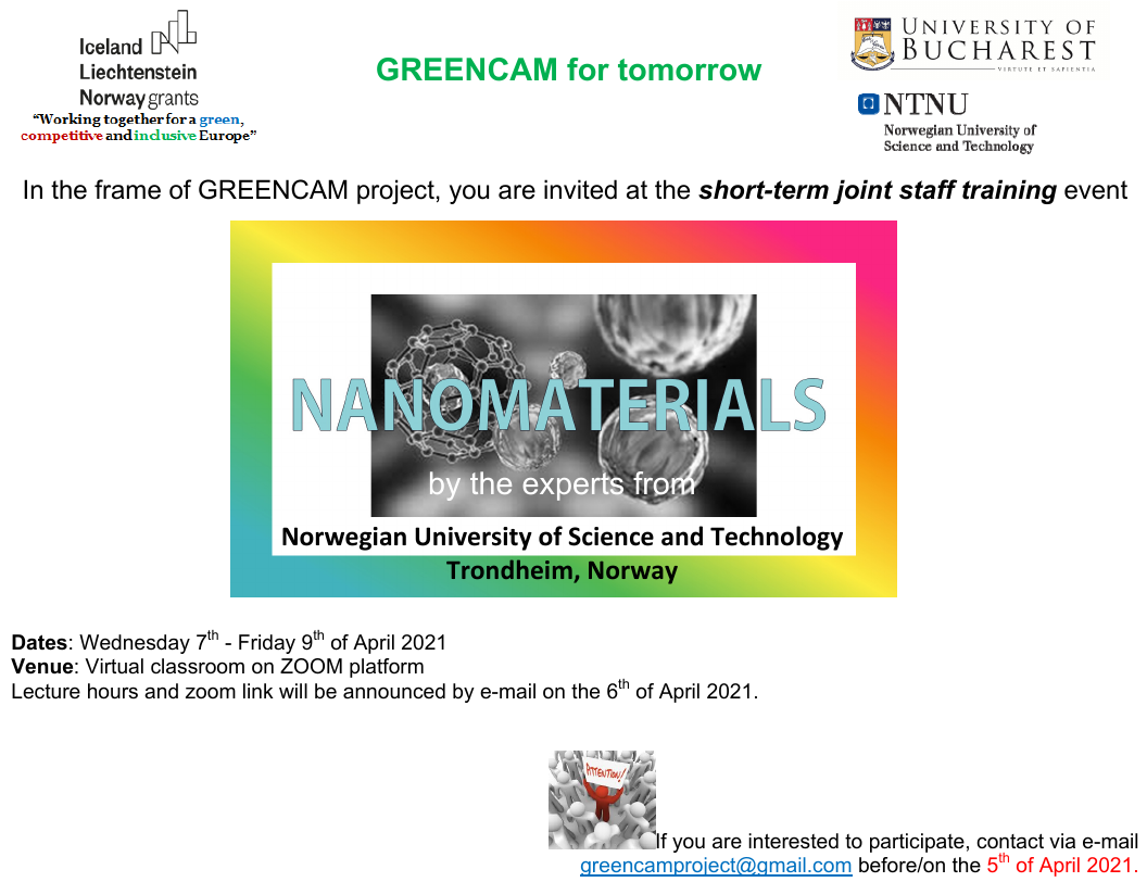 Sunteţi invitaţi să participati la seminarul intitulat Nanomaterials care se va desfăşura în perioada 7-9 aprilie 2021. Seminarul se va realiza în format online pe platforma ZOOM. Seminarul este organizat în cadrul proiectului educaţional GREENCAM (10-COP-0041).