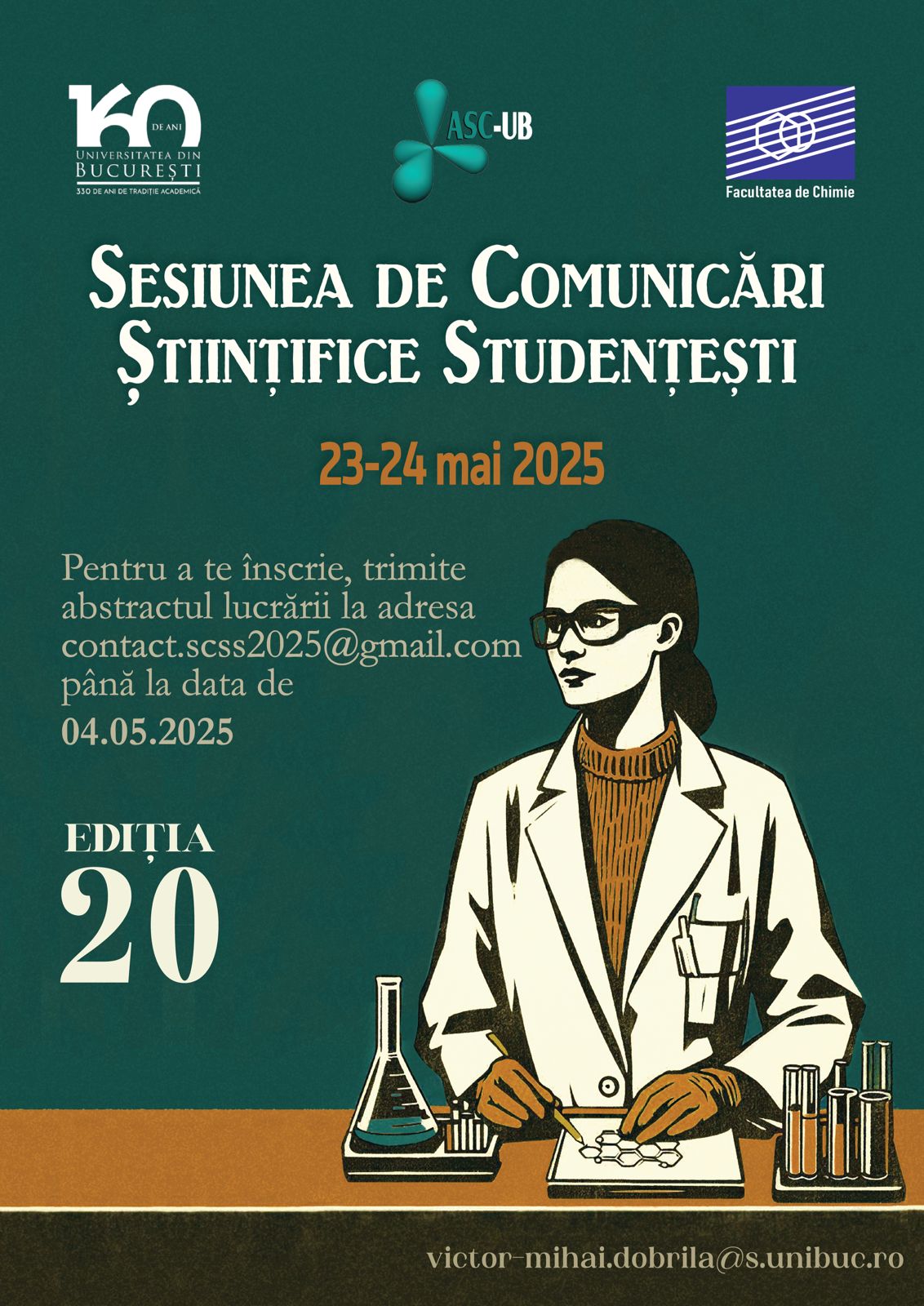 Asociația Studenților Chimiști a Universității din București (ASC-UB) în parteneriat cu Facultatea de Chimie organizează, în perioada 23-24 mai 2025, cea de-a XX-a ediție a Sesiunii de Comunicări Științifice Studenţeşti (SCSS 2025).