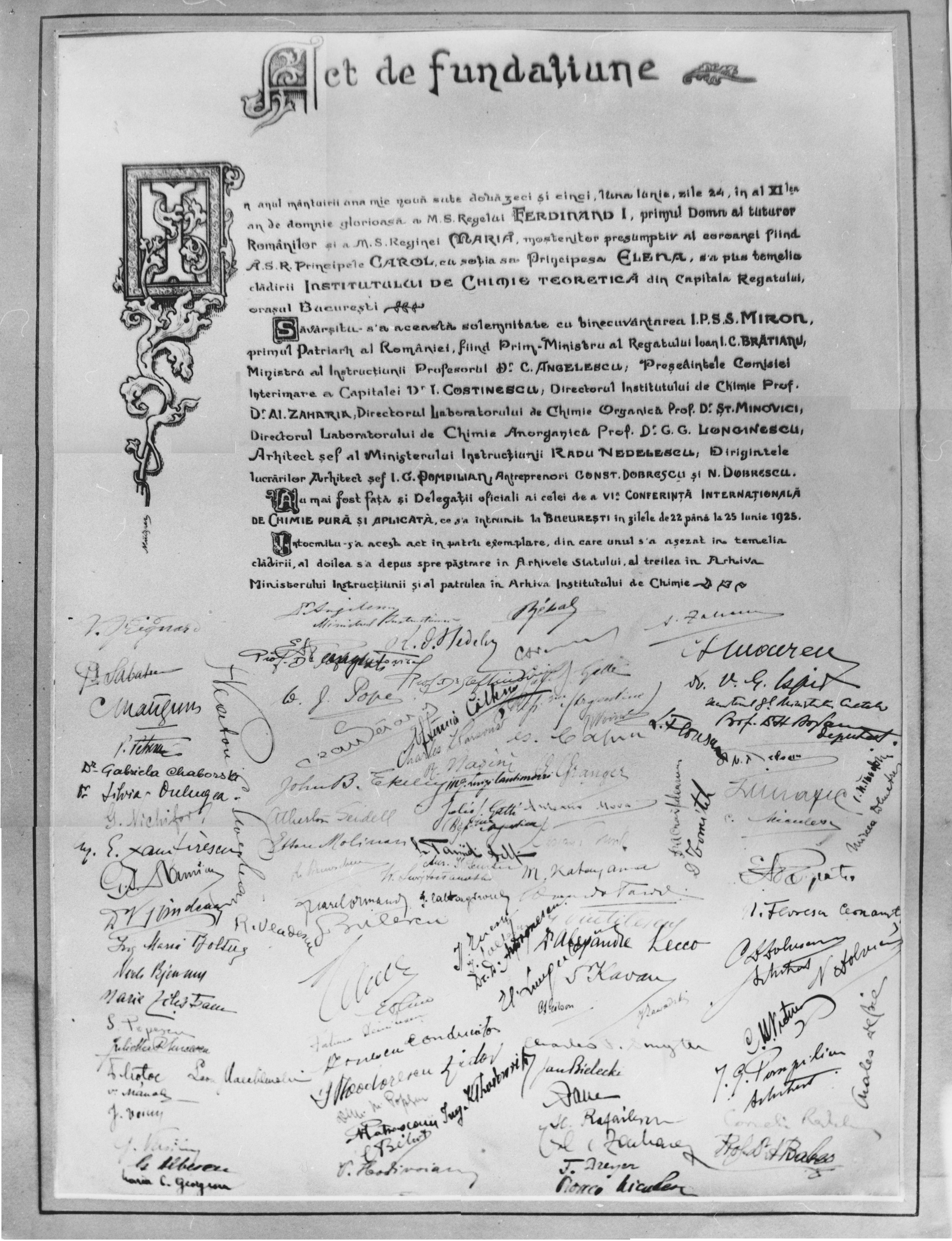 - În anul 1925 s-a aşezat piatra de temelie pentru clădirea Institutului de Chimie Teoretică din cadrul Universităţii din Bucureşti, clădire ce se afla în Splaiul Independenţei nr. 87 - 89 (lângă podul Haşdeu). Institutul de Chimie Teoretică a fost un adevărat centru al învăţământului universitar de chimie din România, şi în anul 1948 a devenit sediul Facultăţii de Chimie a Universităţii din Bucureşti.
