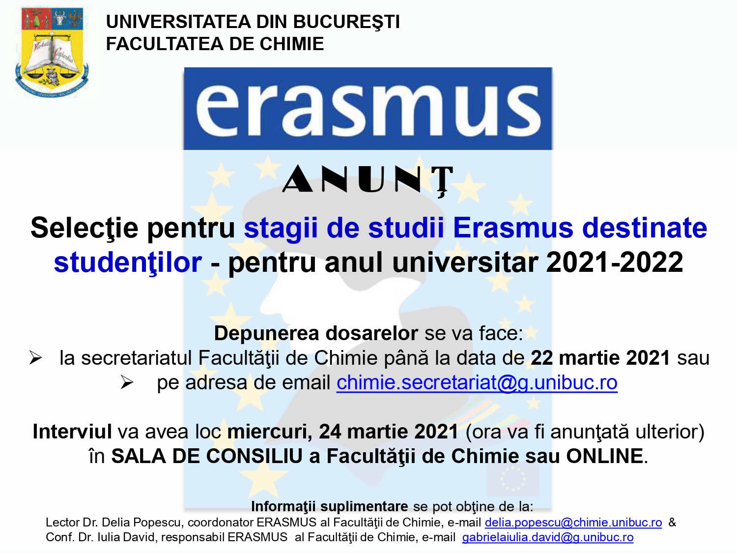 ANUNȚ SELECȚIE STAGII ERASMUS - 2021-2022
