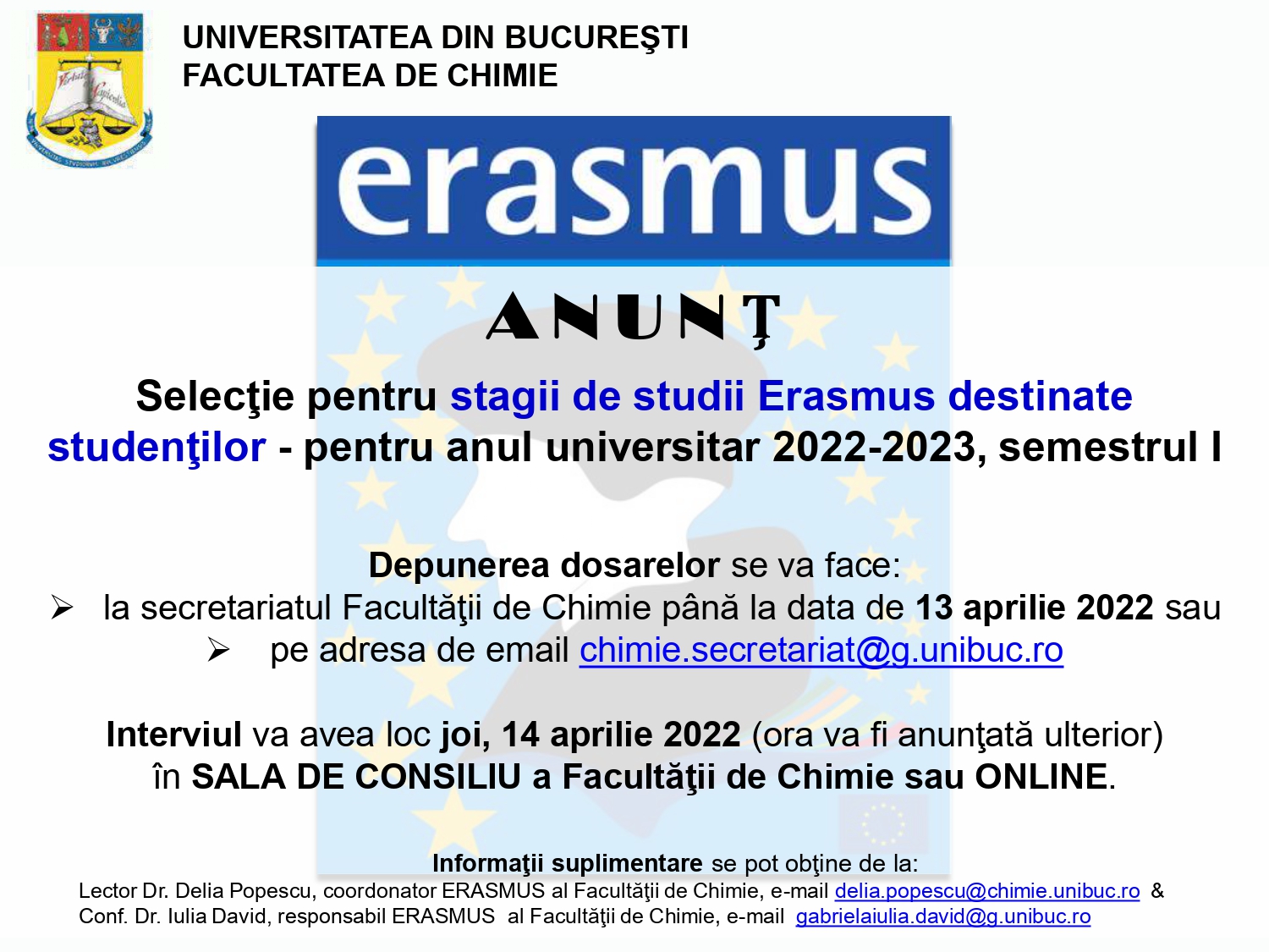 1. Anunţ selecţie ERASMUS 2022-2023, semestrul I - AICI