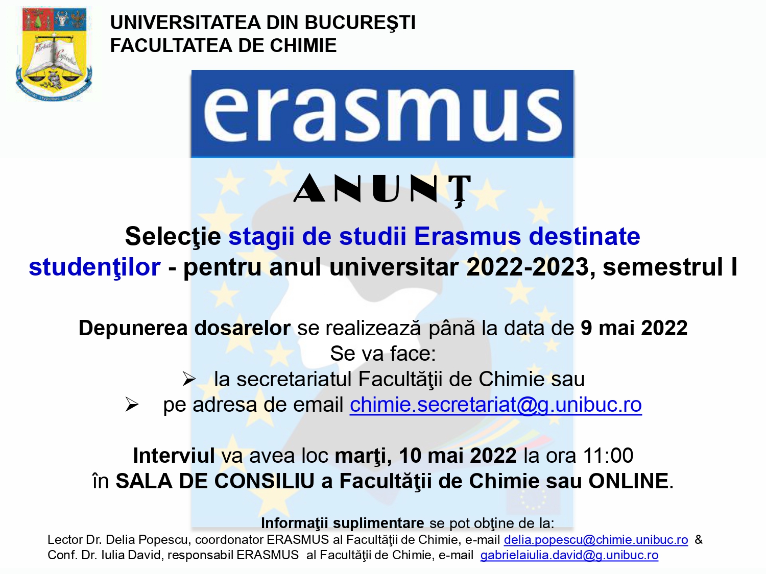 3. Destinaţii ERASMUS pentru Chimie 2022-2023, semestrul I - AICI