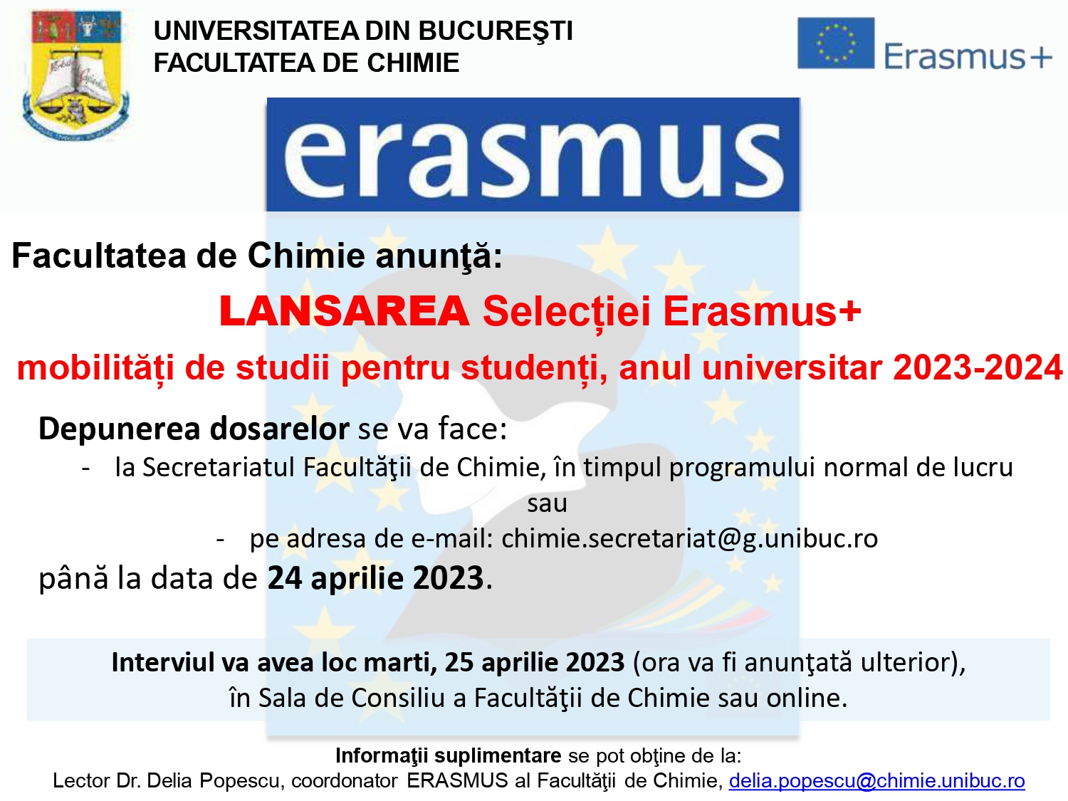 3. Destinaţii ERASMUS pentru Chimie 2023-2024 - AICI