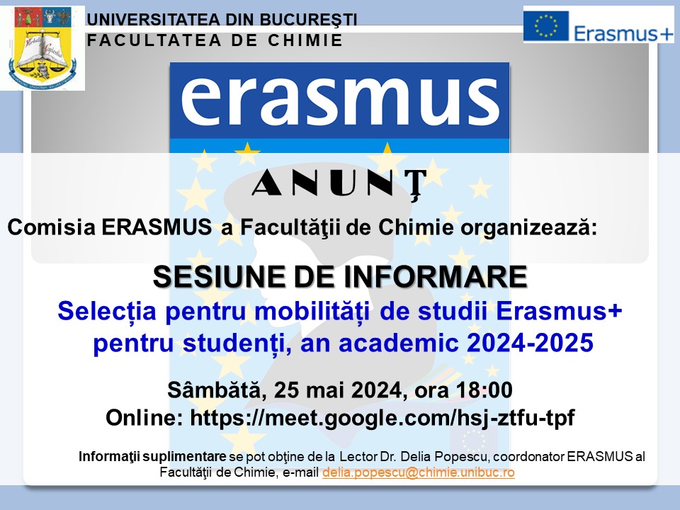 Dragi studenți ai Facultății de Chimie UB, vă așteptăm Sâmbătă, 25 mai 2024, ora 18:00 la sesiunea de informare despre