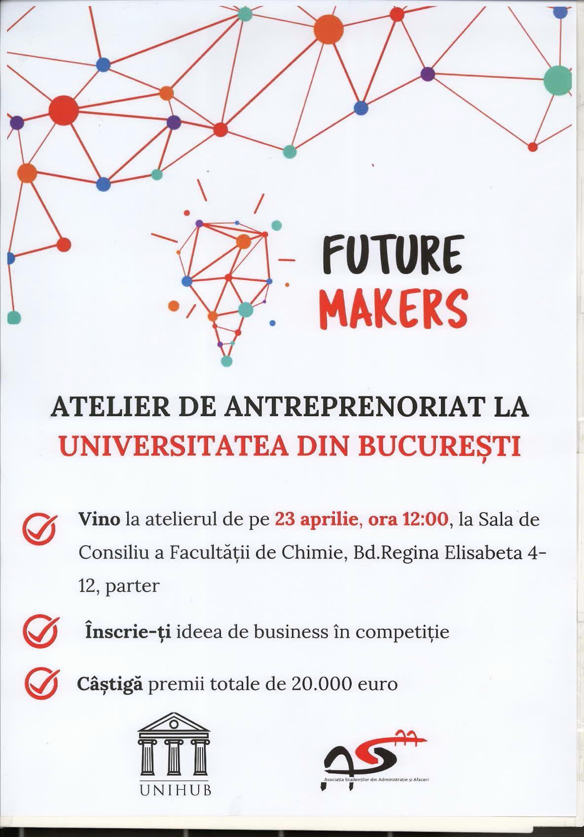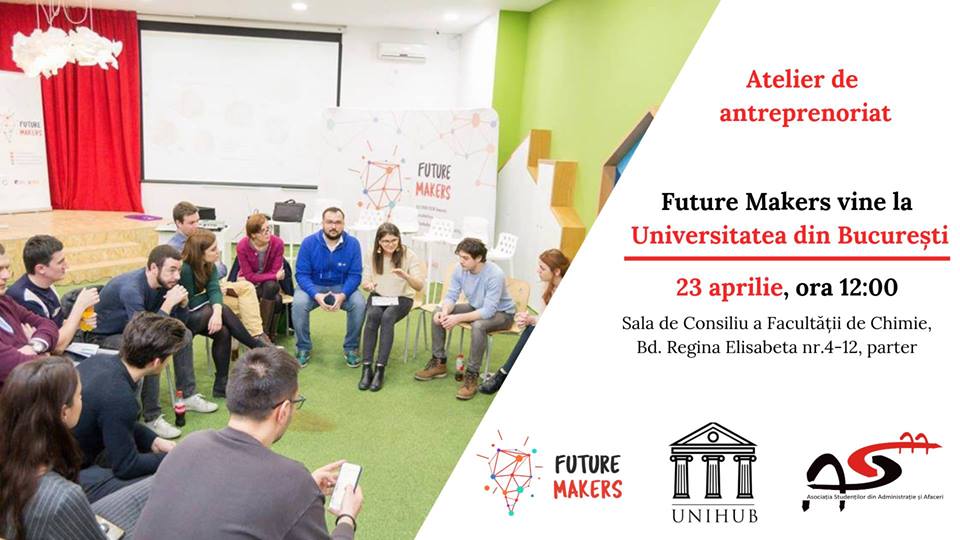 UniHUB Socetatea Antreprenoriala Studenteasca va invita pe 23 aprilie, începând cu ora 12:00, la Universitatea din București, Sala de Consiliu a Facultății de Chimie, Bd. Regina Elisabeta nr.4-12, parter, la un ATELIER DE ANTREPRENORIAT Future Makers.